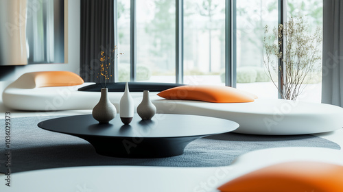 Minimalist interior design of modern living room with abstract furniture and black coffee table
