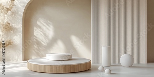 Minimalist interior design with a textured podium and decorative objects, bathed in soft light