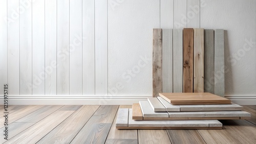 Minimalist Interior Design With Wooden Panels and Stacked Platform in a Room With White Walls and Hardwood Floors