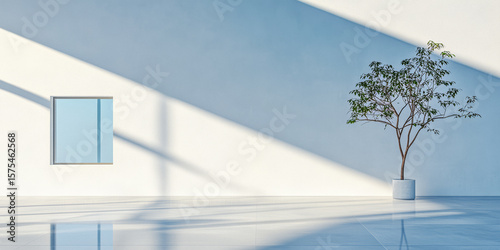 Minimalist interior space featuring a tree and natural light at midday in a bright and airy room