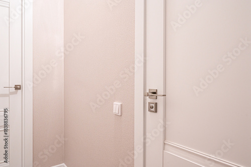 Minimalist interior with white walls, modern door hardware, and neutral-toned light switch, creating a clean, contemporary design aesthetic.