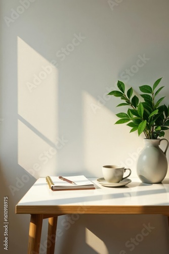 Minimalist kitchen, small table, herbs, tea, notebooks, white, aesthetic, wood