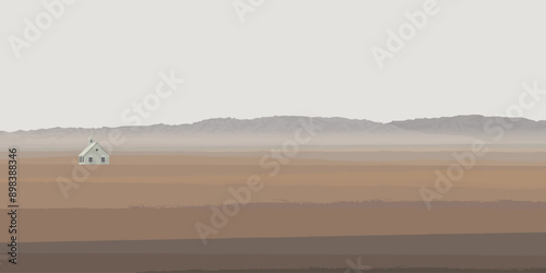 Minimalist landscape desert with old church have mountain ranges behind flat design graphic illustrated.