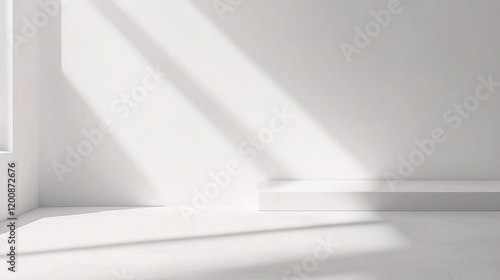 Minimalist Light and Shadow: A clean, contemporary aesthetic, showcasing a simple platform bathed in a stream of natural sunlight, ideal for product presentations or minimal design inspirations.