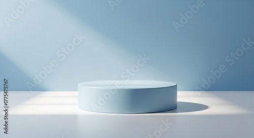 Minimalist light blue podium with soft light and shadow on a pastel blue background