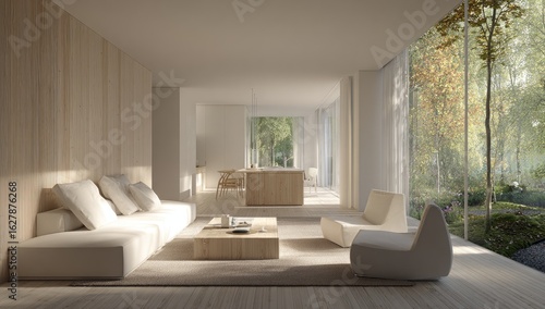 Minimalist, light-filled living area with natural wood accents and large windows showcasing a serene garden