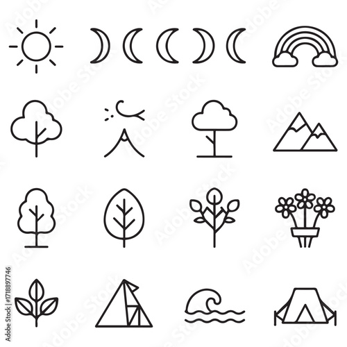 Minimalist line art icon set of nature and outdoors essentials, including sun, moon phases, cloud set, rainbow and more, clean vector outline, thin stroke, modern design