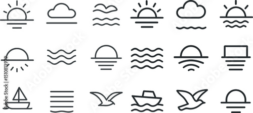 Minimalist line art icons of sunsets, clouds, and birds for elegant design projects