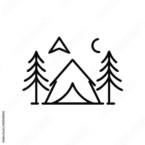 Minimalist Line Art Illustration Tent Under Pine Trees in a Forest