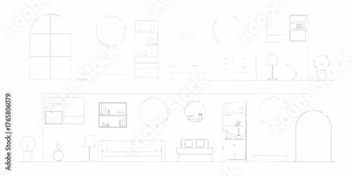 Minimalist line drawing of interior design elements featuring furniture and decor in a clean white aesthetic