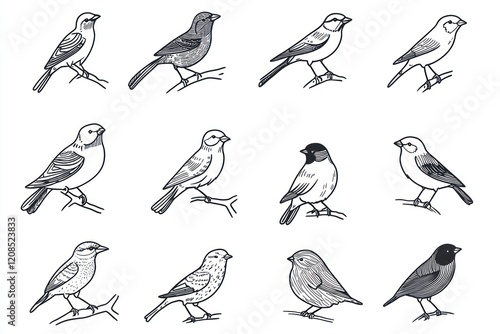 Minimalist line drawings various bird species, ideal for nature and wildlife themes.