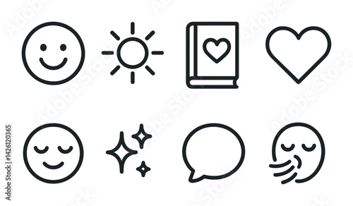 Minimalist line icons set featuring emoticons, sun, book, heart, stars, and speech bubble