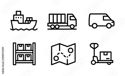 Minimalist line icons set of logistics and delivery with shipping truck and warehouse