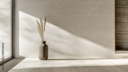 Minimalist living room interior design composition in neutral tones with minimal furniture and natural lighting. Luxury apartment conceptual image.
