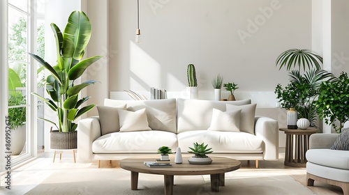 Minimalist living room interior with modern furniture, neutral tones, and decorative plants