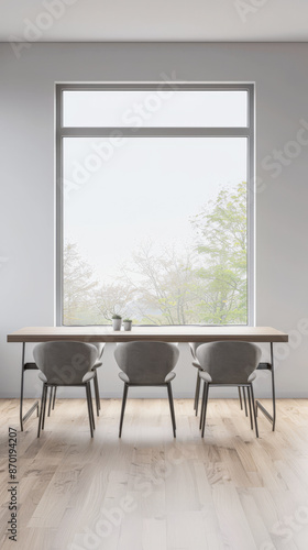 Minimalist living room interiors composition with a dinning table next to a window, no people and minimal furniture. Luxury Real Estate composition.