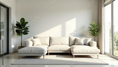 Minimalist living room, neutral palette, plush sofa, scandi, cushions, aesthetic