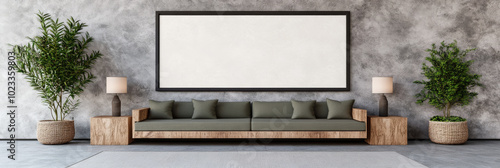 Minimalist living room with a large framed canvas above a long wooden couch.