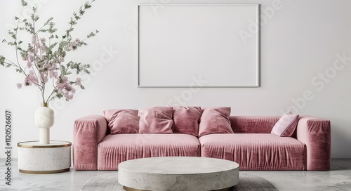 Minimalist living room with a pink sofa. a round coffee table. a vase with flowers. and a large blank picture frame