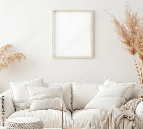 Minimalist living room with a white sofa. a large frame on the wall. and pampas grass in a vase