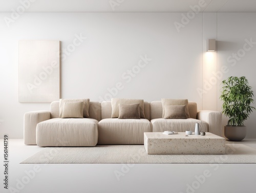 Minimalist living room with beige sectional sofa, low coffee table, and neutral d?cor on a light rug against a white wall