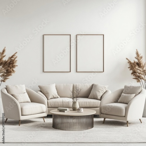 Minimalist living room with beige sofa, armchairs, coffee table, and pampas grass.