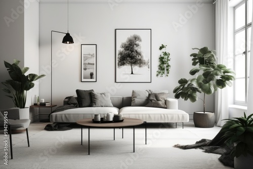 Minimalist Living Room with Black and White Wall Art, Generative AI
