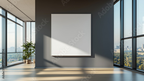 Minimalist Living Room with Empty Canvas Frame Grey Wall and Large Window View