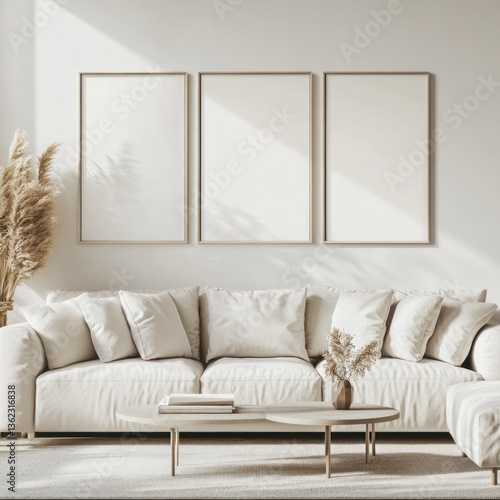 Minimalist living room with three blank frames, off-white sofa, pampas grass, and coffee table.