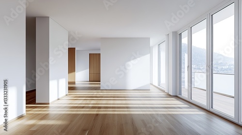 Minimalist living room with white walls and wood floor, embodying simplicity and modern elegance.