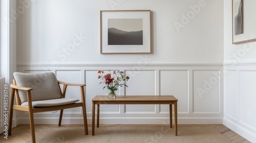 Minimalist living room with wooden chair, table, and artwork.