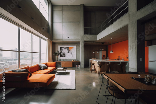Minimalist Loft Design. Dark orange color palette. Centered perspective. Interior Design