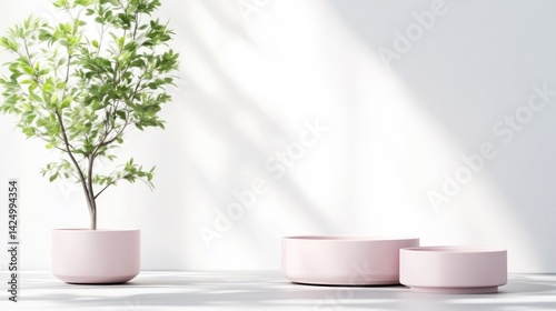 Minimalist, modern, and serene interior scene with a small potted plant and light pink podiums. Natural light casts soft shadows on the white wall