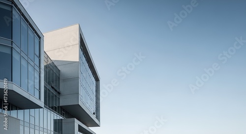 Minimalist Modern Architecture of a Glass and Concrete Building Against a Clear Blue Sky