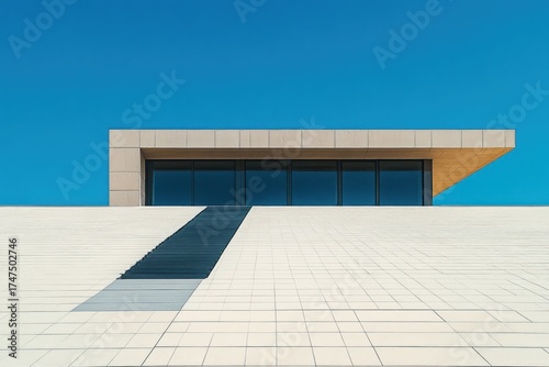 Minimalist modern building facade with beige tiled exterior, large glass windows, geometric shadows, and clear blue sky