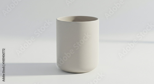 Minimalist modern empty white ceramic cup standing on white background casting shadow