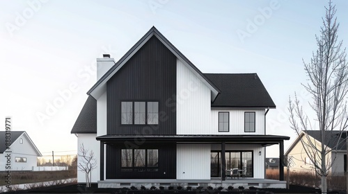 minimalist modern farmhouse with a strikingly simple black and white design, set against the backdrop of a suburban neighborhood