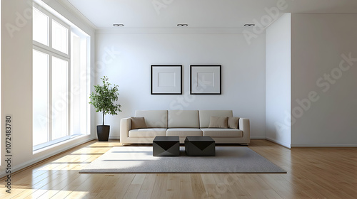 Minimalist Modern Living Room with White Walls, Soft Beige Sofa, and Geometric Black Coffee Table for a Clean, Light-Filled Space