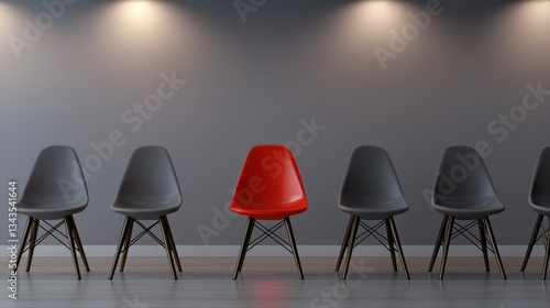 Minimalist Modern Office Design With Identical Chairs and One Distinct Red Chair Accent
