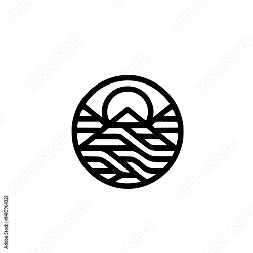 Minimalist Mountain and Sea Logo: Sunset in a Circle