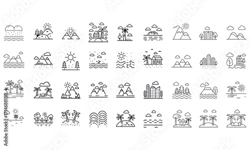 Minimalist Nature Icons And Mountains, Trees, Sun, Clouds, Forest & Outdoor Line Art