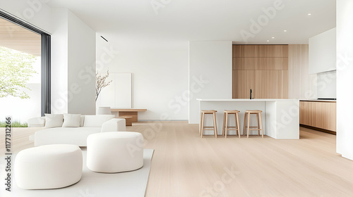 Minimalist open-plan living room and kitchen with light wood floors and white walls, garden view, modern home design, interior design inspiration.