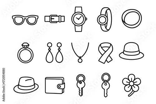 Minimalist outline icons of fashion accessories including jewelry and hats