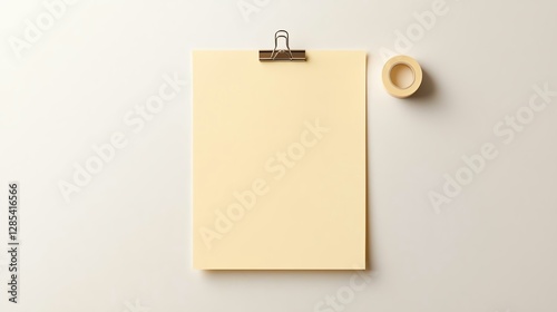Minimalist overhead of blank paper on clip with roll of tape on neutral background.