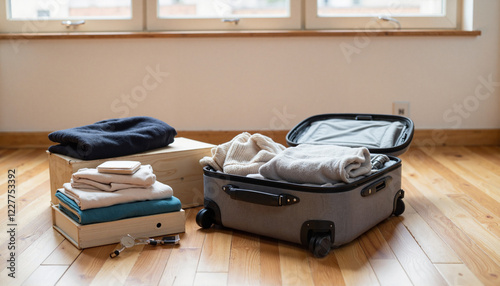 Minimalist packing essentials neatly arranged on wooden floor, simplicity