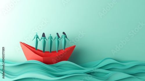 minimalist paper art illustration, 5 women standing in red origami boat, geometric waves in turquoise blue, soft mint green background, business attire silhouettes, paper craft style, floating on