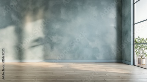 Minimalist Pastel pale light blue empty room interior blank wall background backdrop with plants window light shadows online presentations webinars virtual meetings teams video call desktop wallpaper