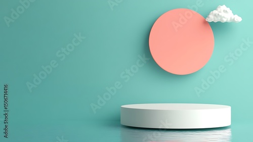Minimalist Pastel Scene: White Cylinder Platform, Coral Circle, and Fluffy Cloud Against a Teal Background