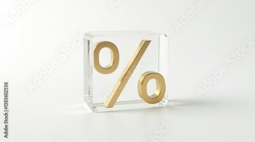 Minimalist percentage cube made of transparent glass with subtle gold accents, placed on a white background for a clean and elegant financial concept