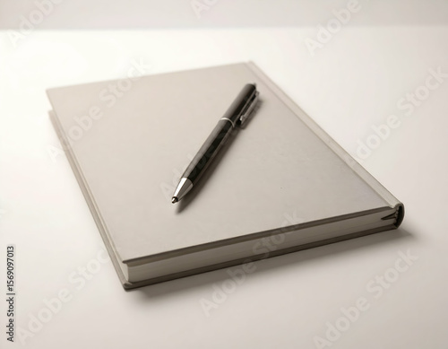 Minimalist photo of a closed gray notebook with a black pen resting on it, placed on a clean white background.
